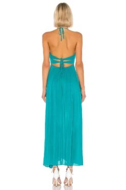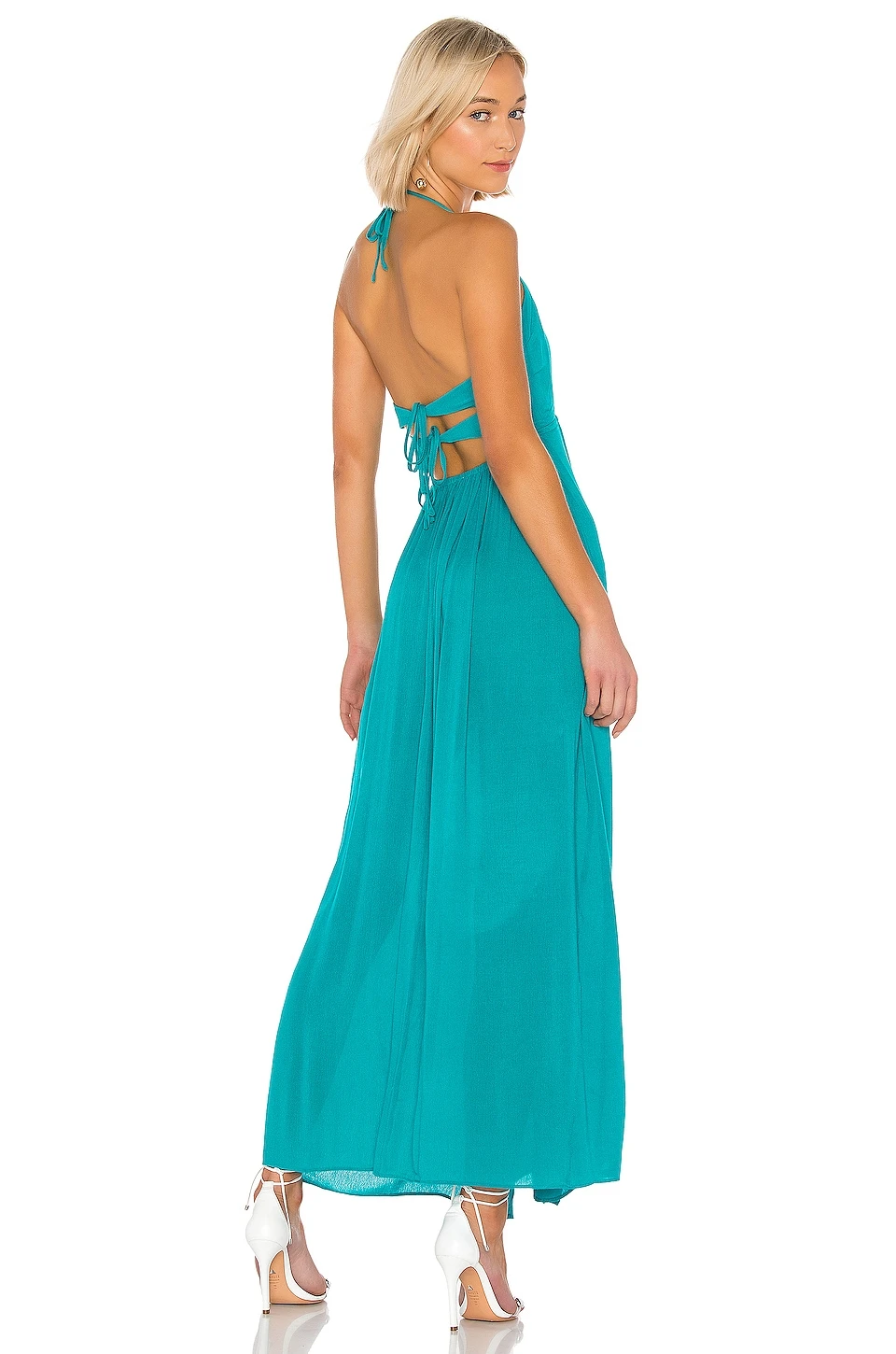 Self: 100% rayon.Lining: 100% cotton. Hand wash cold. Partially lined. Halter styling with tie closure. Front slit details. Back tie closures with cut-outs. Imported. Revolve Style No. SPDW-WD604. Manufacturer Style No. SDD489 S19.