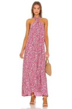 Polyester blend. Imported. Dry clean recommended. Unlined. Halterneck styling with loop button closure. Open back design. Lightweight flowy satin fabric. Revolve Style No. NMAR-WD55. Manufacturer Style No. S152.