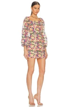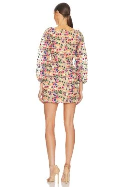 - Sheer tulle fabric with stitched floral designs throughout