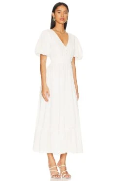 Cotton blend. Handmade in India. Machine wash. Fully lined. Partial front loop button closure.Smocked waistband. Puff sleeves. Lightweight linen fabric. Revolve Style No. CLEO-WD421. Manufacturer Style No. C23SP38018.