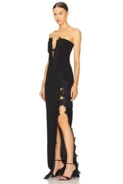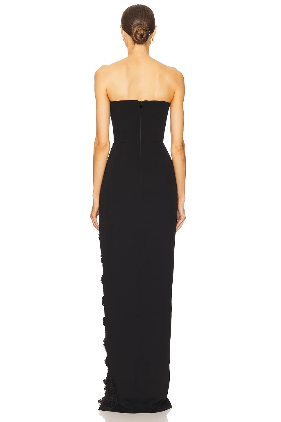 - Midweight crepe fabric with floral lace trim and side seam slit
