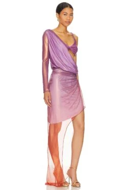 - Ombre mesh overlay ruched at sides with asymmetric hem