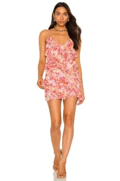 Self: 100% poly.Lining: 95% poly, 5% elastane. Made in China. Hand wash. Fully lined. Pull-on styling. Adjustable shoulder straps. Chiffon fabric with ruffle trim throughout. Revolve Style No. LOVF-WD3103. Manufacturer Style No. ACD1113 F21.