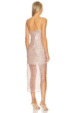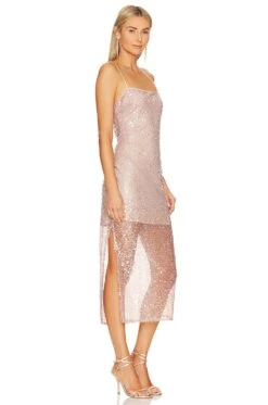- Sequined mesh fabric overlay with metallic threading and side seam slit
