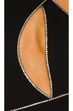 - One shoulder styling with asymmetric front cut-out and crystal embellished trim