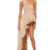 - Midweight ruched slinky jersey fabric with asymmetrical hem