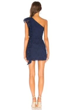 - Dark tones sashay with airy eyelet cotton in Lovers + Friends’ Seana Mini Dress. Dipped in a dreamy midnight blue, this one-shoulder dress is perfect for making evening impressions with its flattering waist tie and side ruffle trim. Accessorize with your fave precious jewels for a look of lowkey glam.