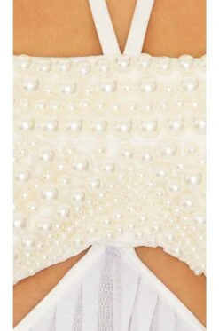 - Detachable pearl embellished top with halterneck tie closure and exposed back zipper closure